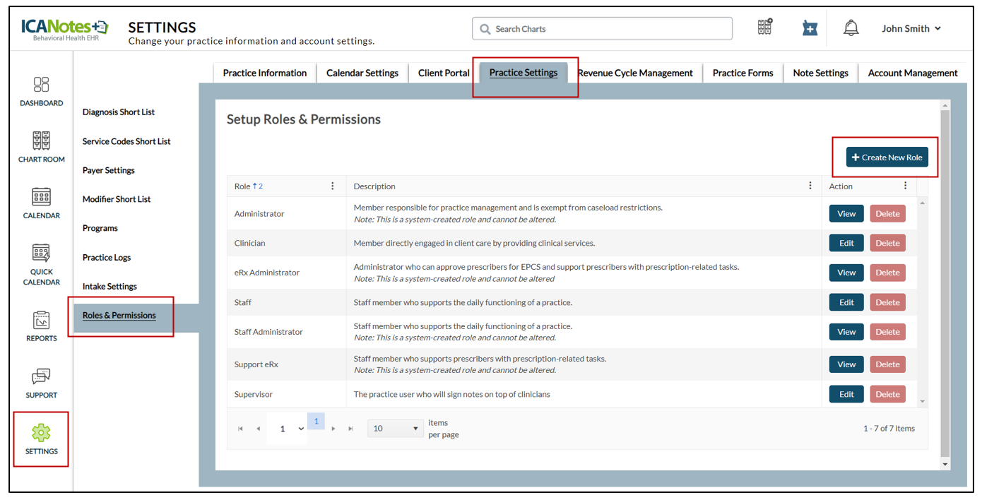 On the top, select the Practice Settings tab > select the Roles & Permission from the left menu.