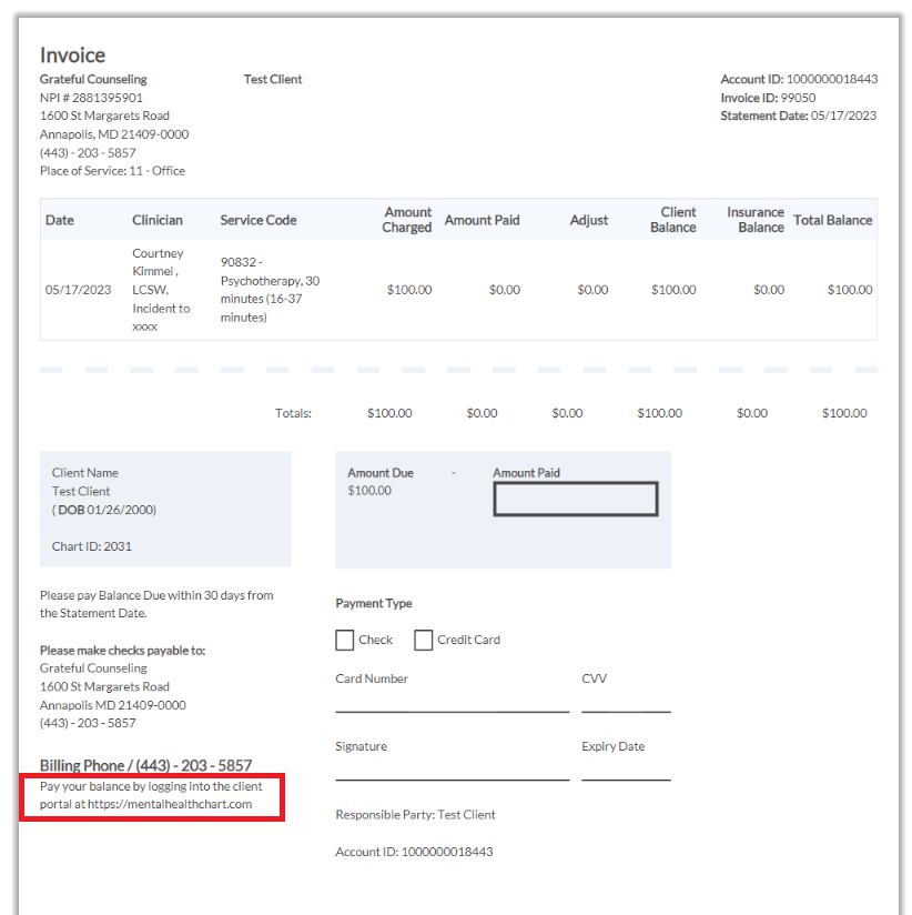 When printing an invoice from a note, the custom invoice note appears in the lower-left corner of the invoice, beneath the practice phone number.