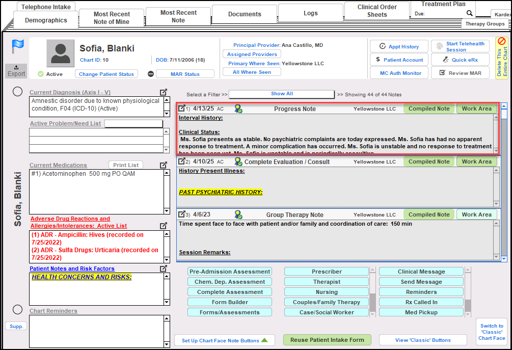 A finished Progress Note can be modified to include an addendum, even if the note has already been finished/compiled. From the client’s Chart Face, locate the note to be modified, then click to enter the Work Areas