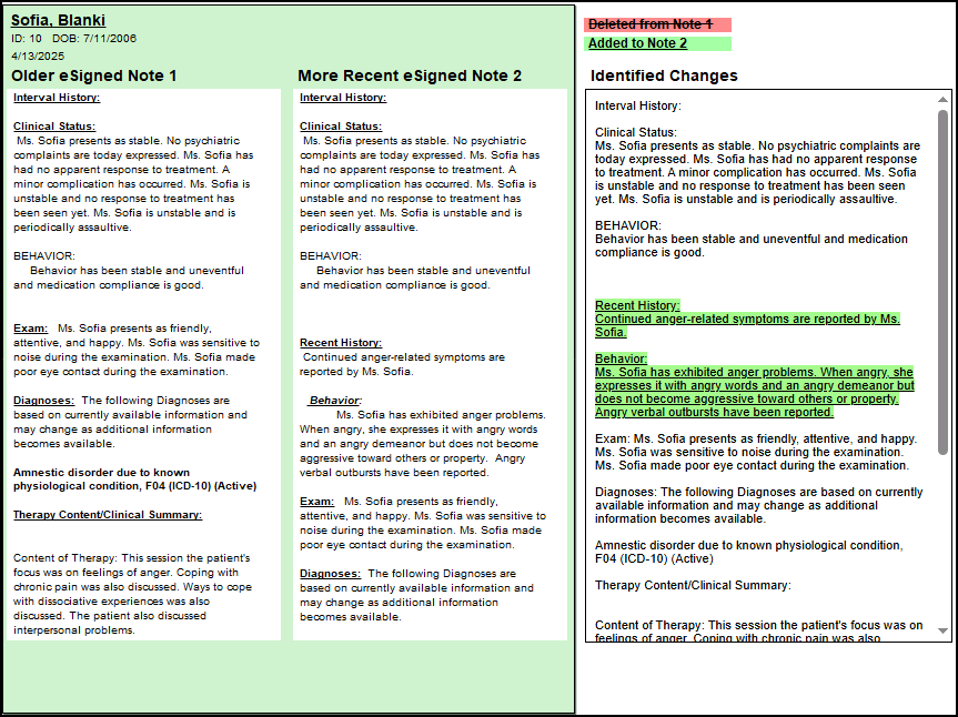 You can now visually compare each version of the note to see what was deleted (highlighted in red) and/or what was added (highlighted in green)