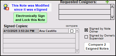 From the Finished Note screen, all changes made to the note are displayed in the note preview on the left. On the right, the note can be electronically signed a second time by clicking to Electronically Sign and Lock this Note