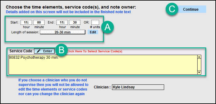 3. Once you click to compile the Treatment Plan, the following dialog will appear.. Enter time spent or units (A), select the service code(s) (B), and click 'Continue' (C). You may also re-assign the Treatment Plan to a different clinician from this window.