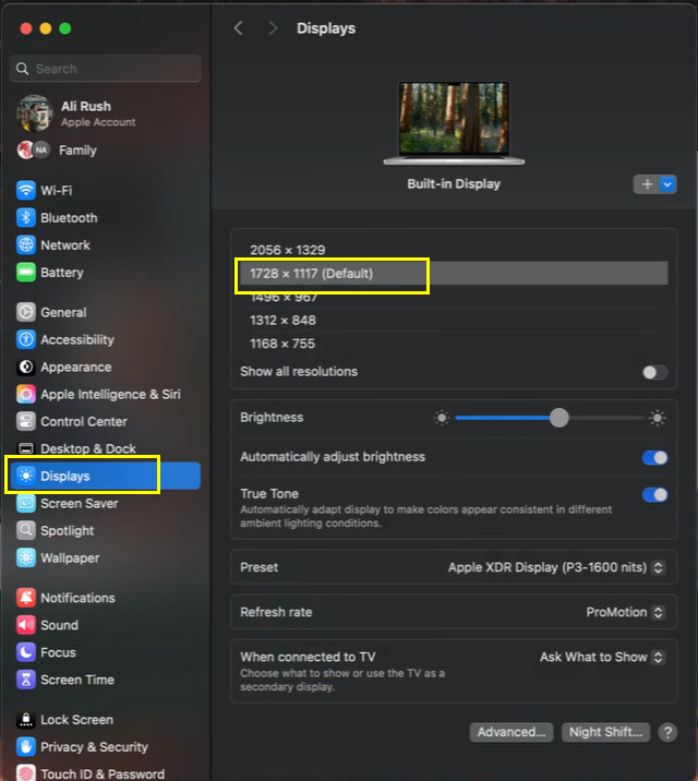 On macOS Ventura and Sonoma, System Settings shows a visual preview when you hover scaled options — use that preview to choose the best fit.