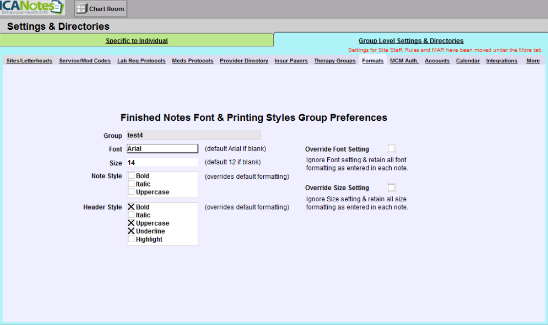This tab will allow you to set the default Font, Size and Style for printing notes across the system your entire group. You can also specifically edit your group's note header style, as seen in the field below. Please note that these changes will not be visible within ICANotes, they will only apply when printing. Your notes will appear the same in the Compiled Note screen as well as in the saved PDF file of the note.
