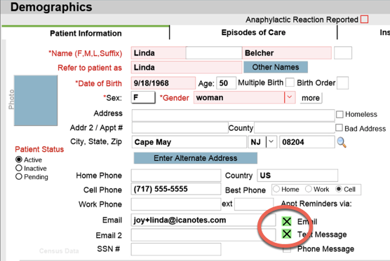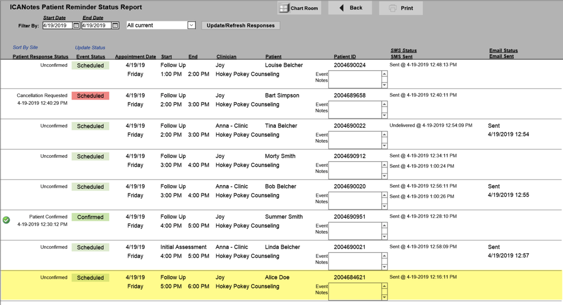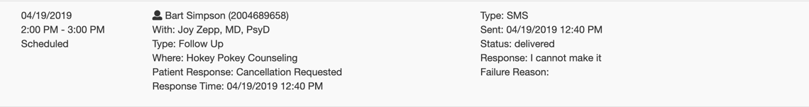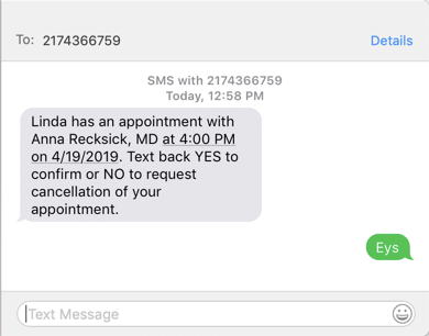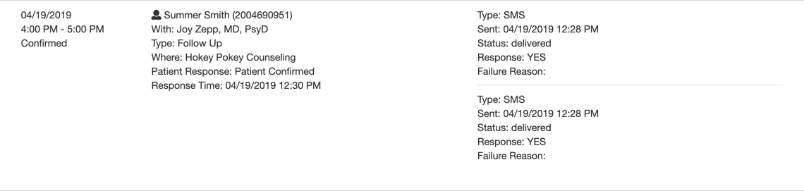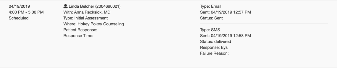 The Appointment Report shows her response. Note that also it shows that an email was sent to her too since this patient has both email and text marked in demographics.