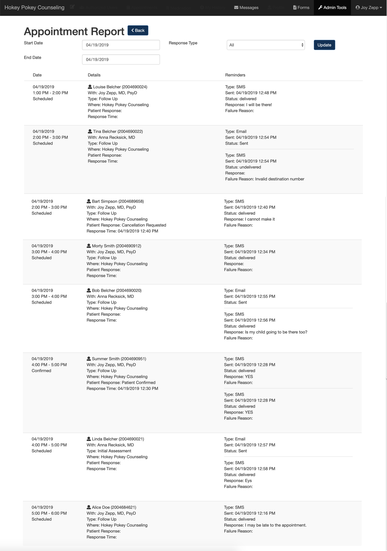 Since Summer responded yes, the Appointment Report only shows that she will attend the appointment.