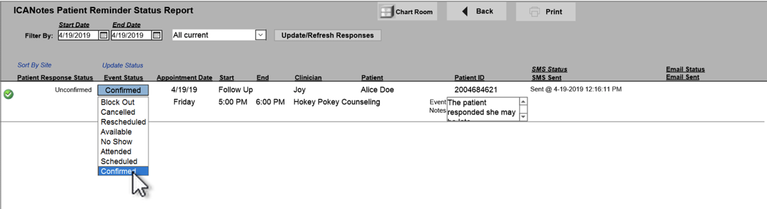 6. I can then go back to the Patient Reminder Status Report and update. I can even add the patient's comment under Event Notes.