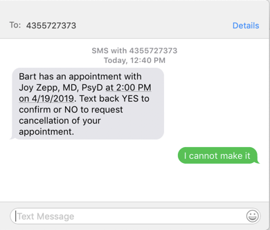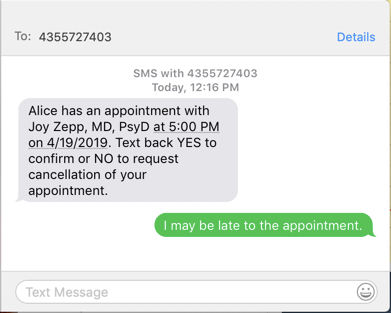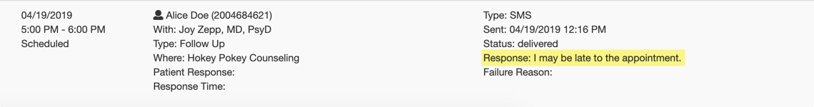 My patient, Alice Doe, was scheduled for an appointment on 4/19/2019 at 5 pm. She received her text message and wanted to express that she might be late.