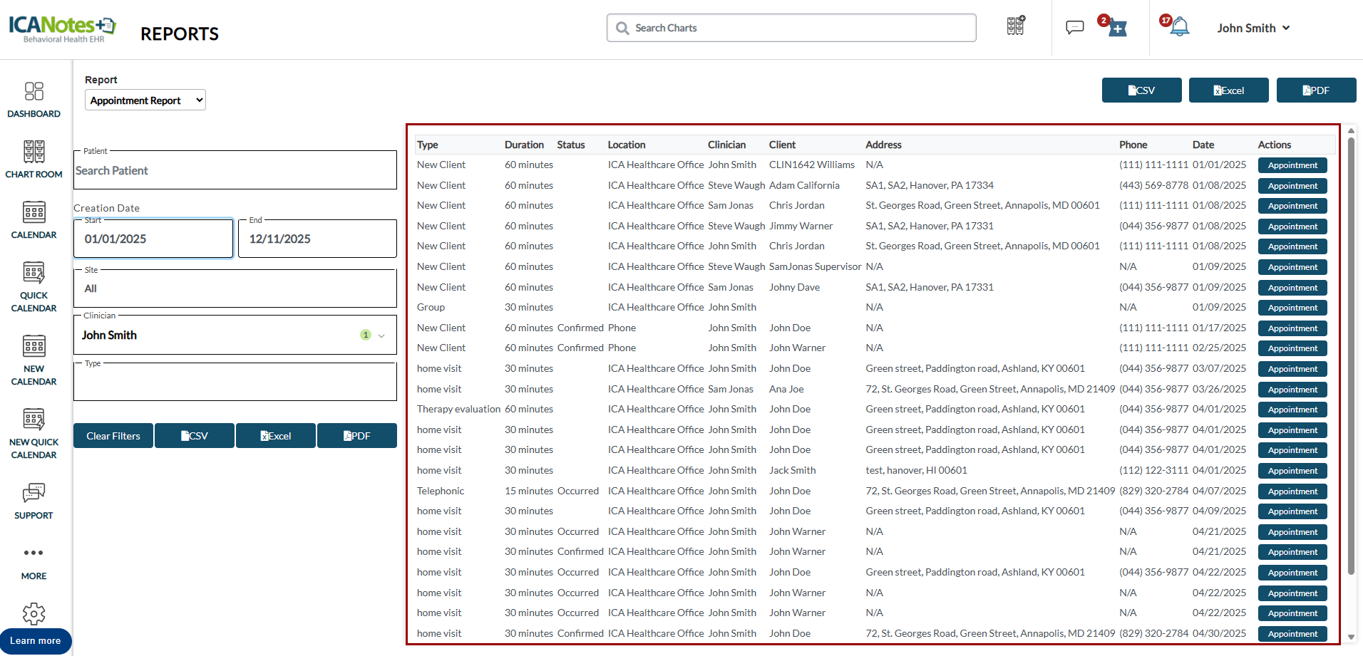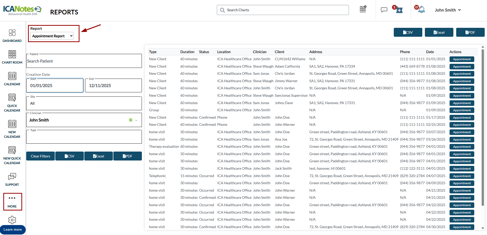 This report can be exported in CSV, PDF, or Excel format, similar to other reports. Users must have the appropriate permission to access the Appointments Report.