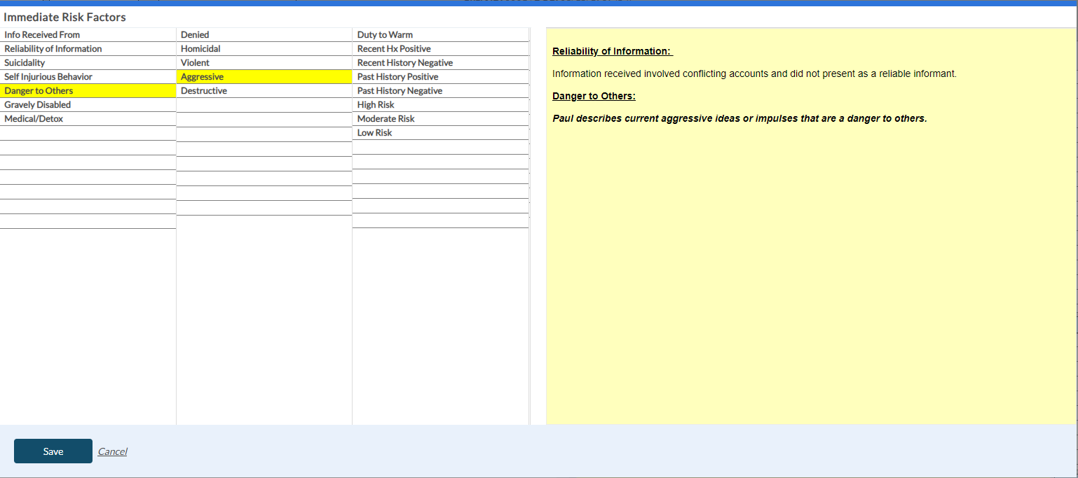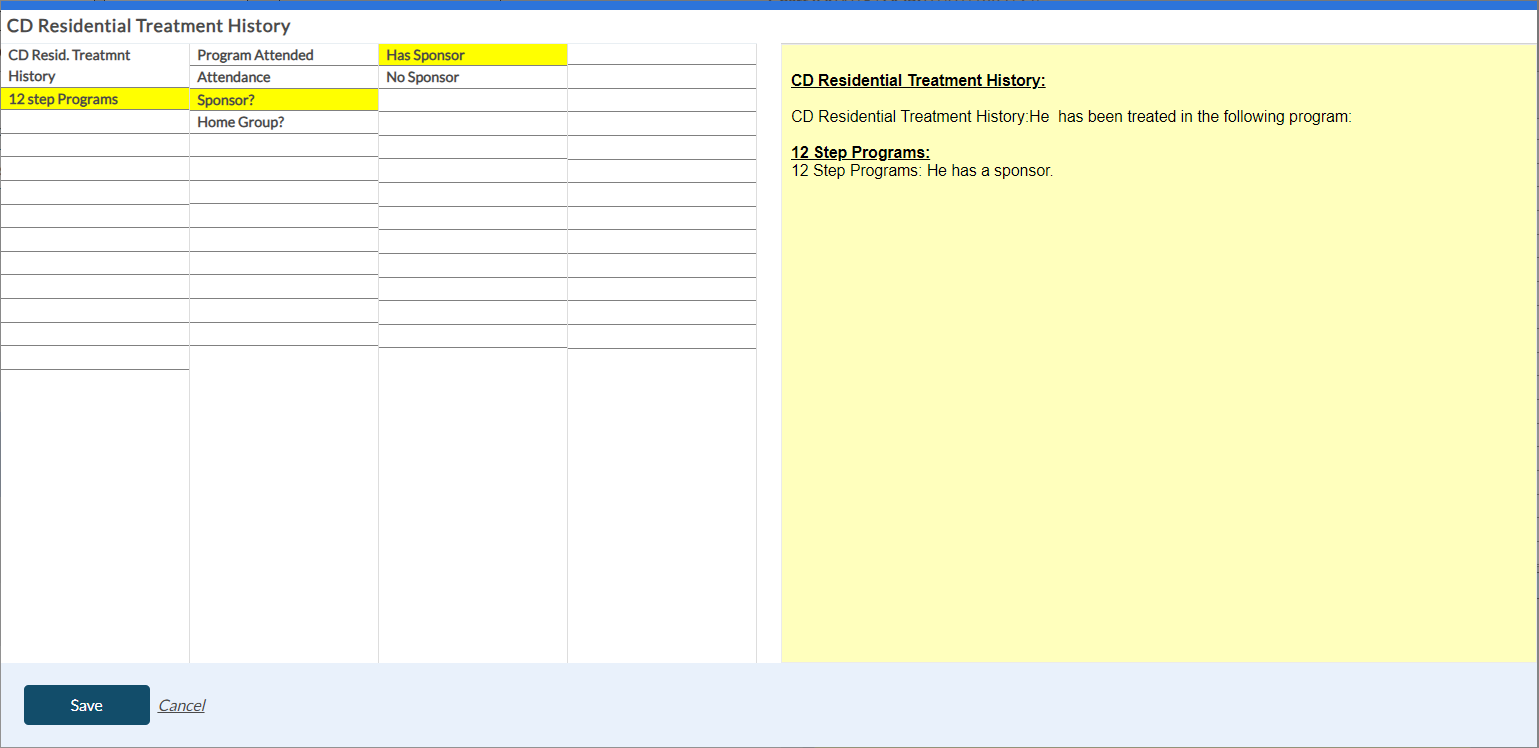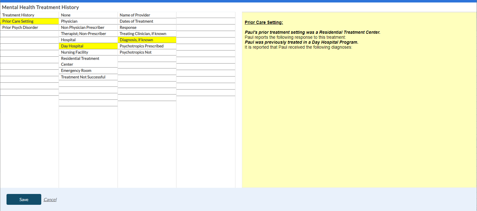 When you select the Mental Health Treatment History button in the Dimension 3 tab, the following screen appears to enter the shrub content. Once you save the shrub content, it appears in the yellow card within the Dimension 3 tab with the risk rating details.