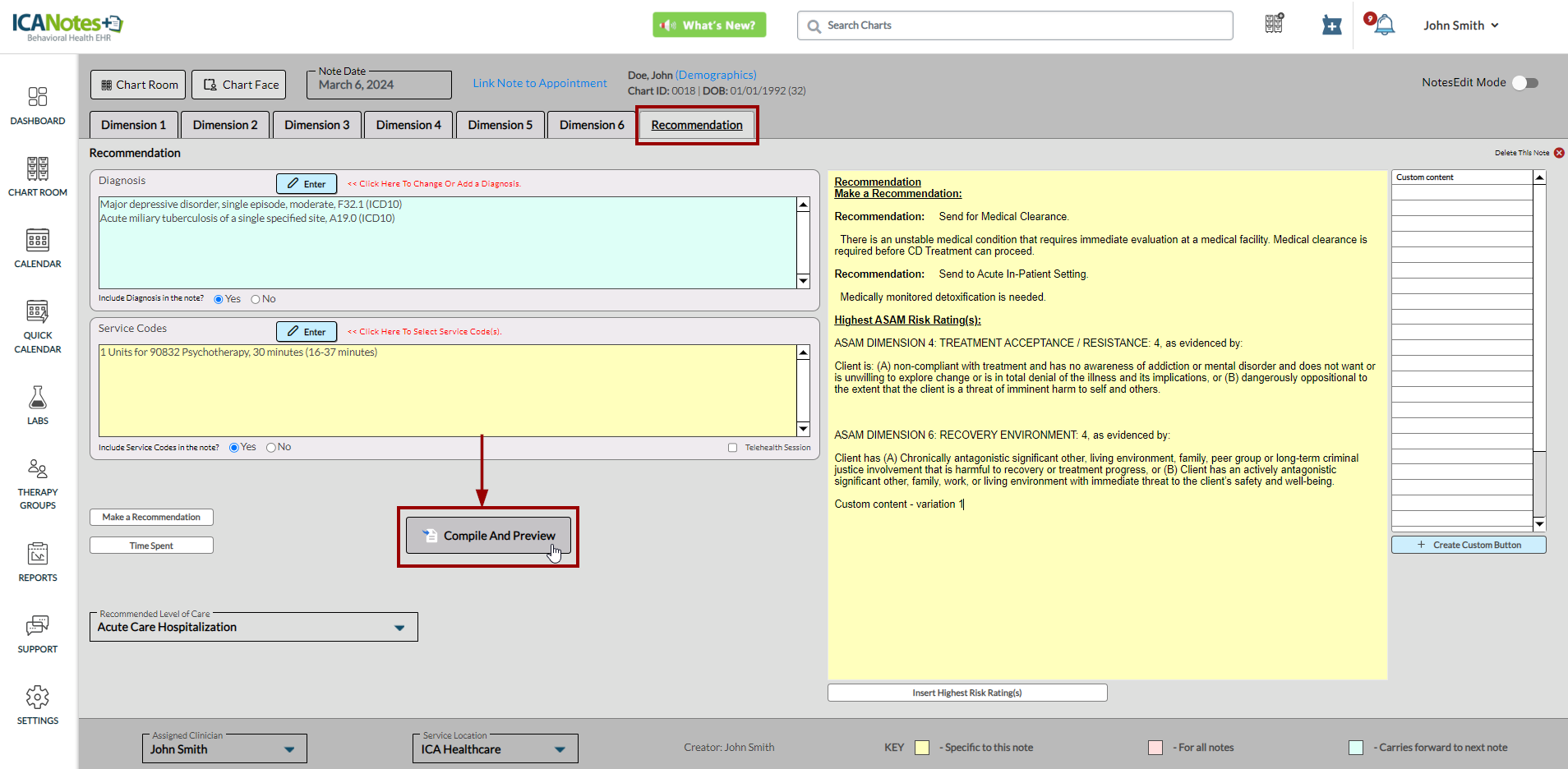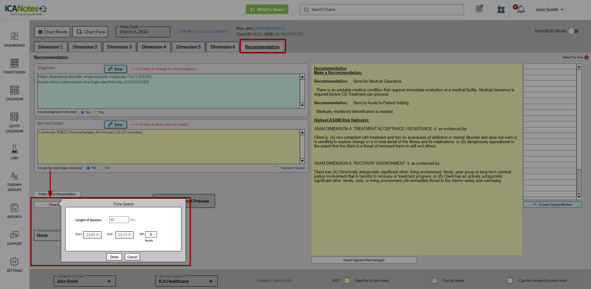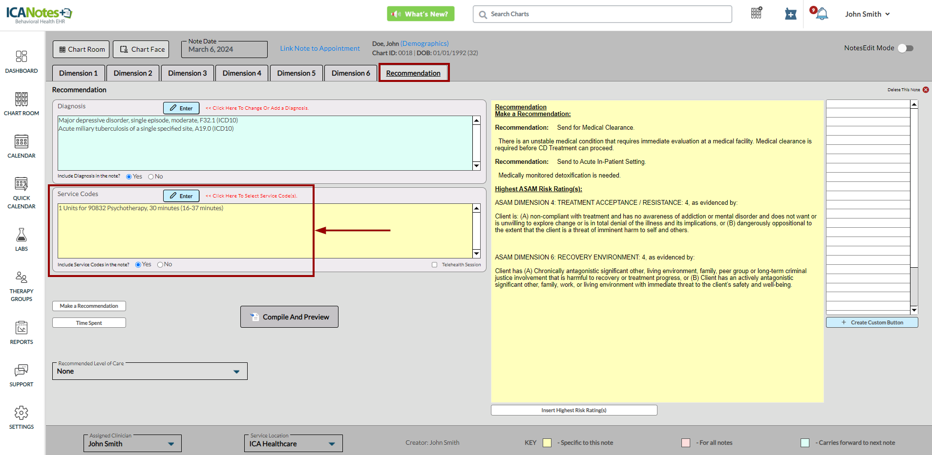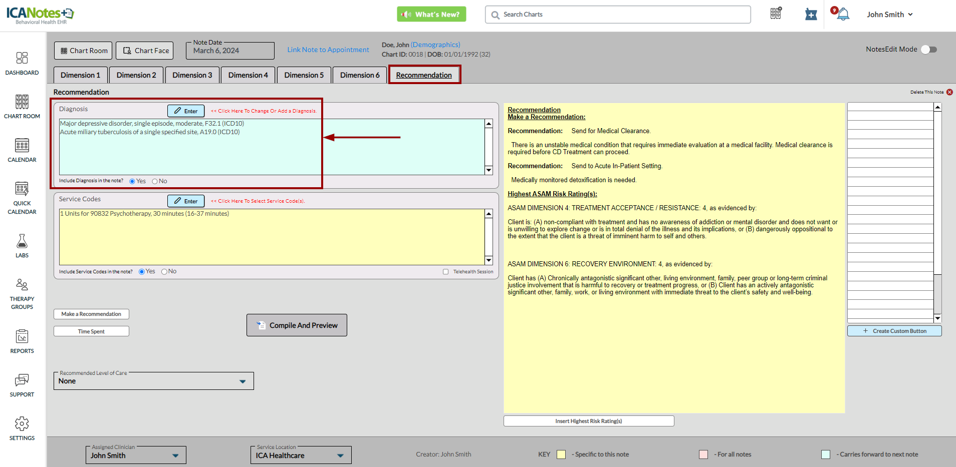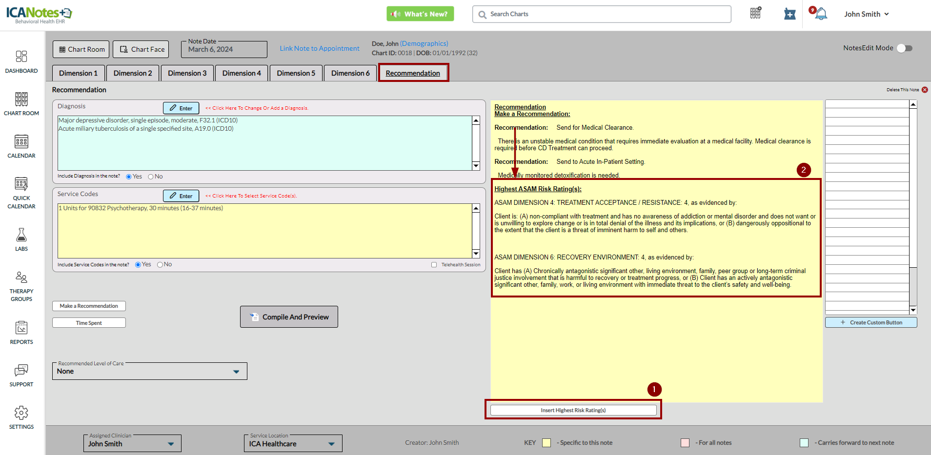 ICANotes+ enables you to document information within the ASAM note, which comprises six dimensions. After recording details for each dimension, you can generate and preview the note from the Recommendation tab. Within this tab, you can enter diagnosis codes, service codes, offer recommendations, document time spent, and insert the highest risk ratings. These entries will subsequently be incorporated into the compiled note.