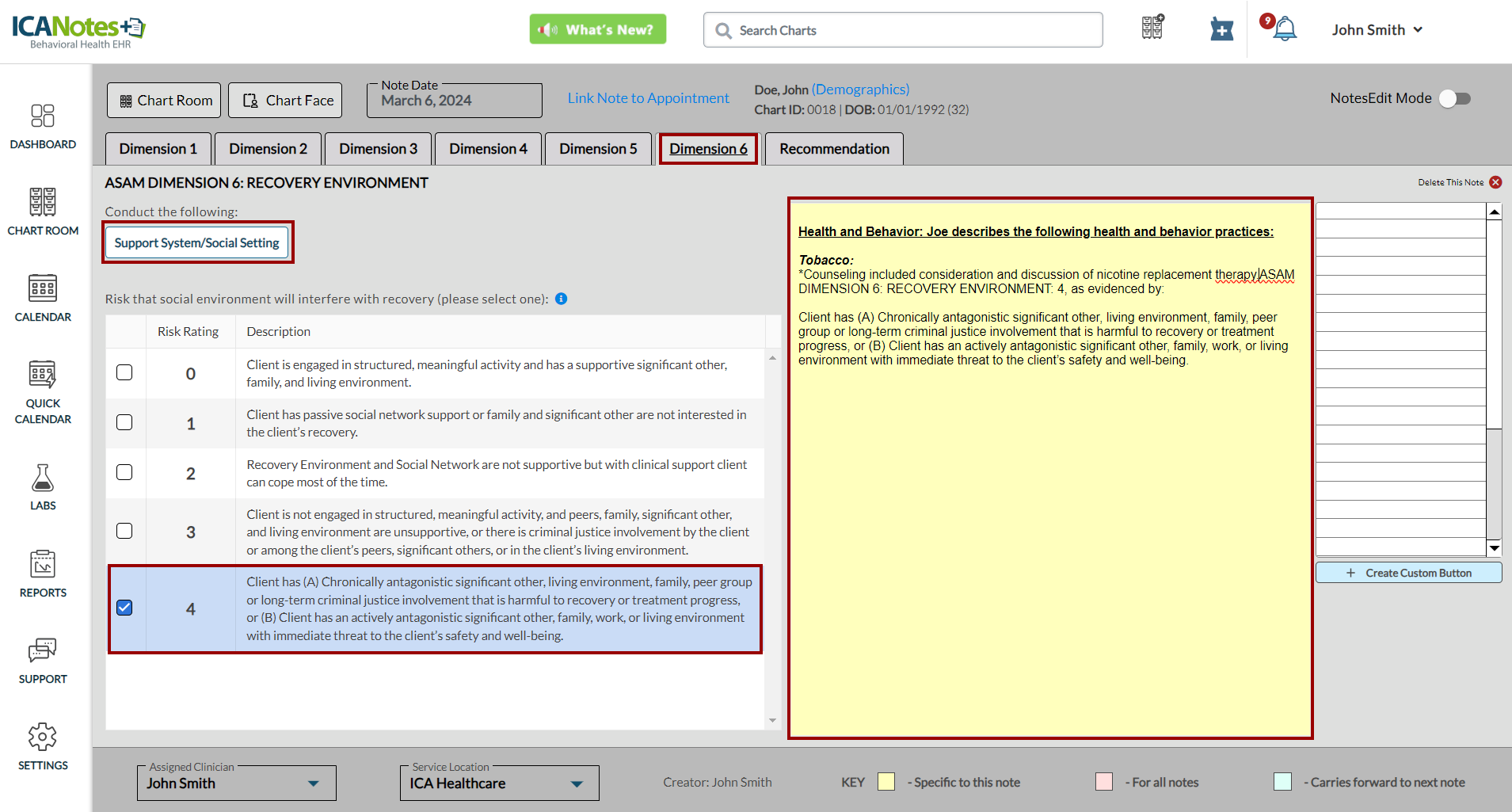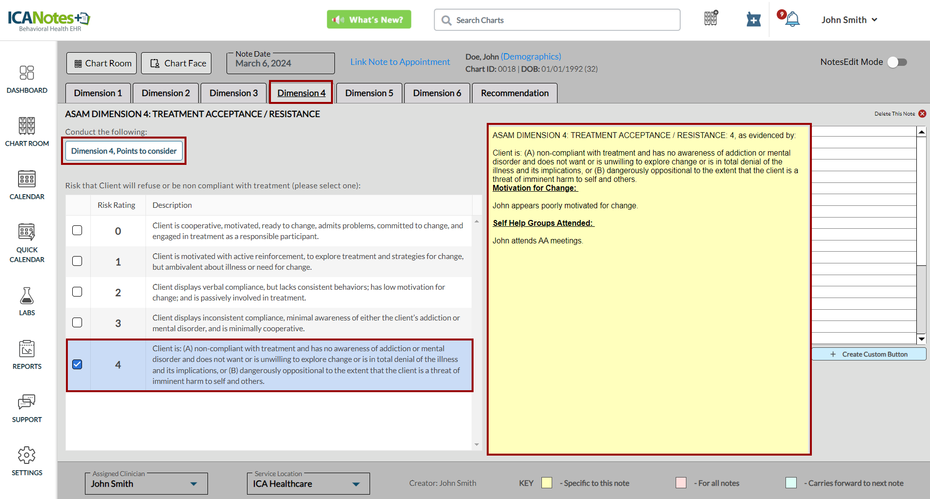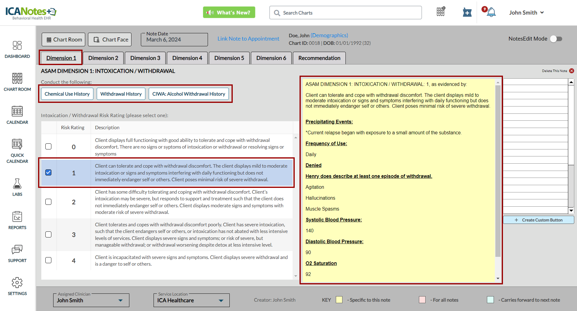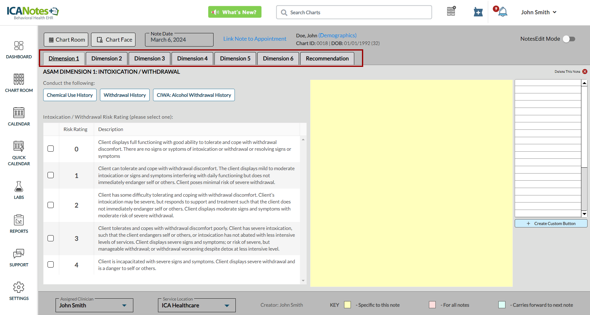 ICANotes+ enables you to document information within the ASAM note, which comprises six dimensions. After recording details for each dimension, you can generate and preview the note from the Recommendation tab. Within this tab, you can enter diagnosis codes, service codes, offer recommendations, document time spent, and insert the highest risk ratings. These entries will subsequently be incorporated into the compiled note.
