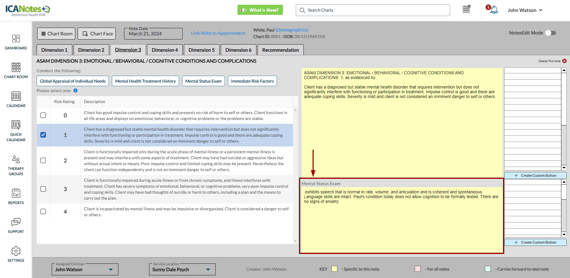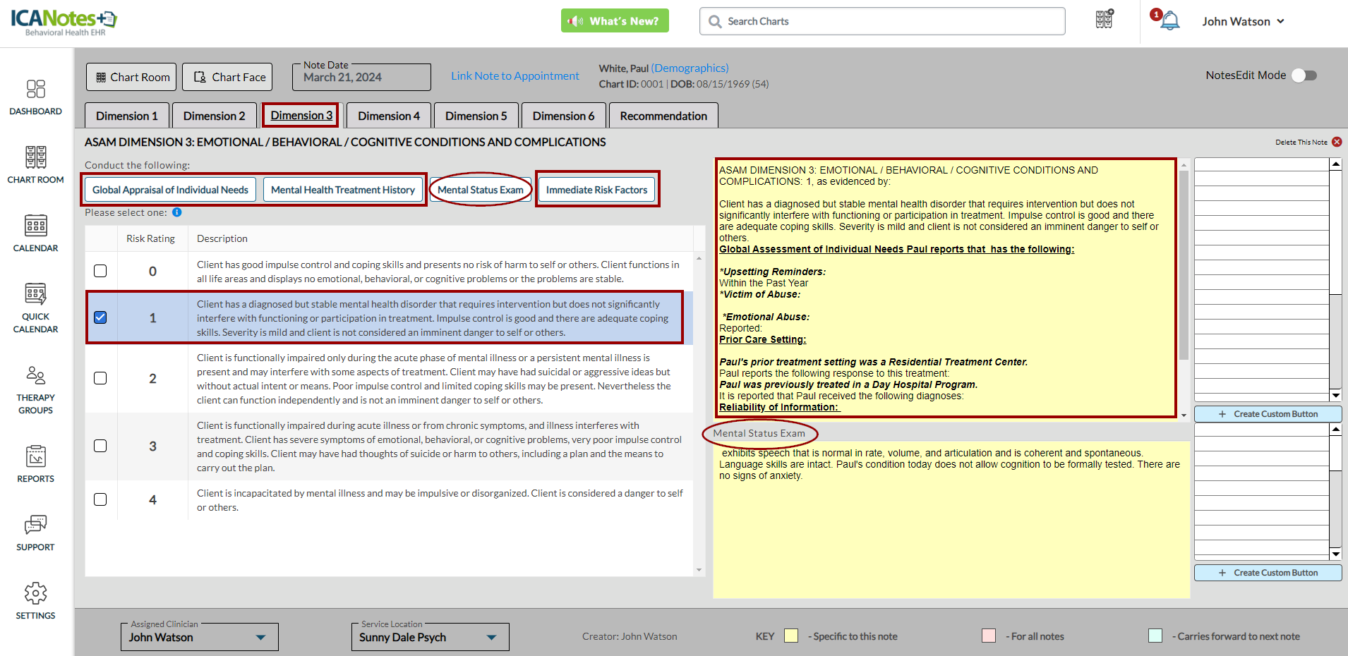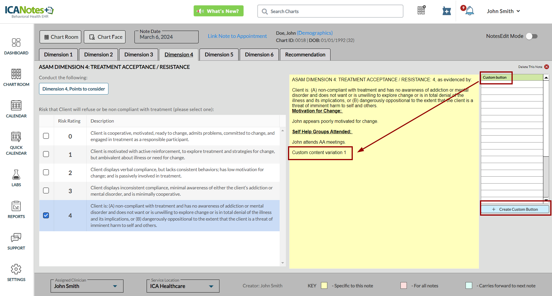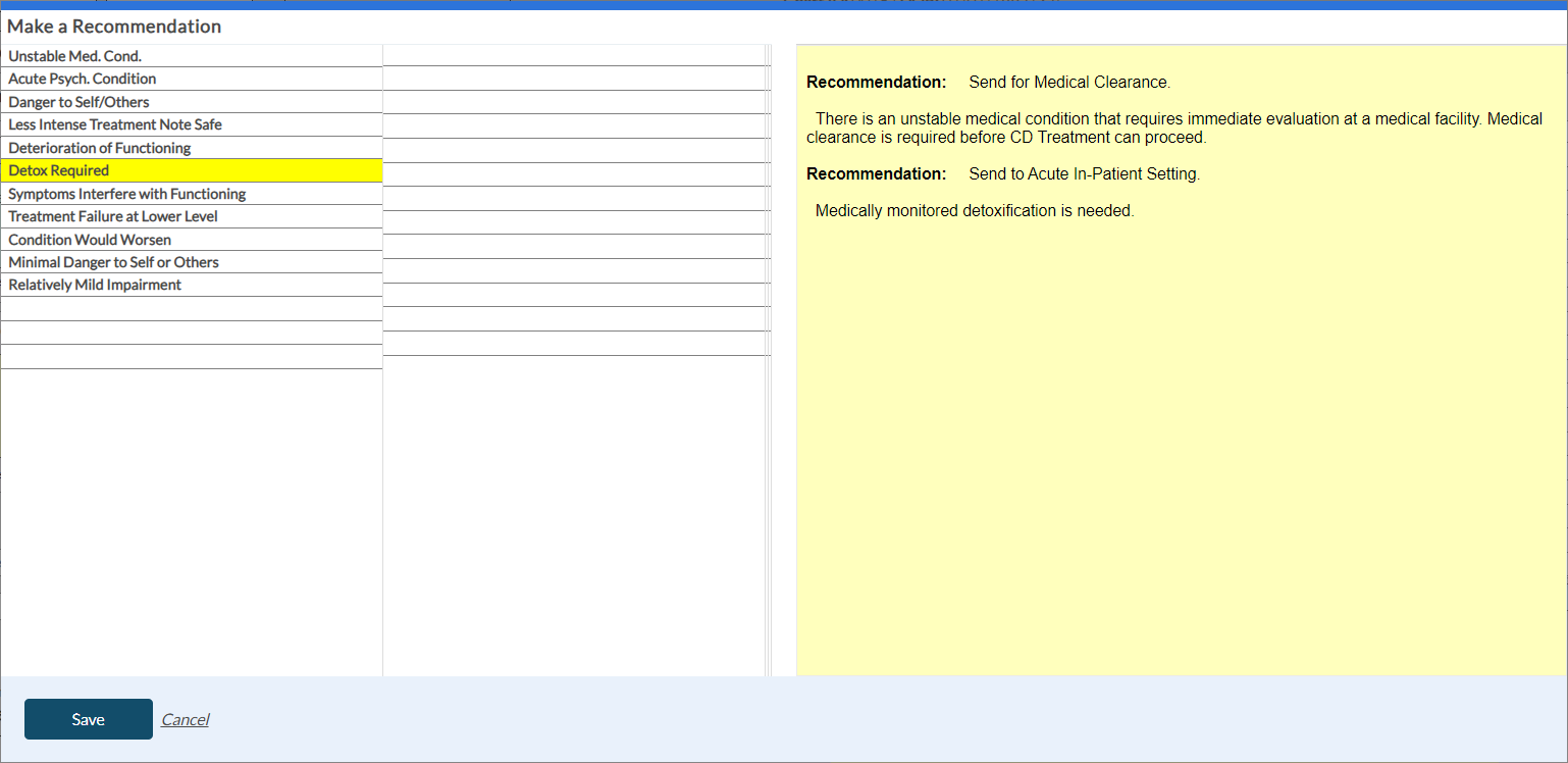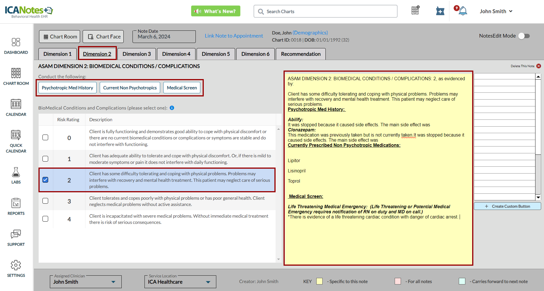 ICANotes+ enables you to document information within the ASAM note, which comprises six dimensions. After recording details for each dimension, you can generate and preview the note from the Recommendation tab. Within this tab, you can enter diagnosis codes, service codes, offer recommendations, document time spent, and insert the highest risk ratings. These entries will subsequently be incorporated into the compiled note.