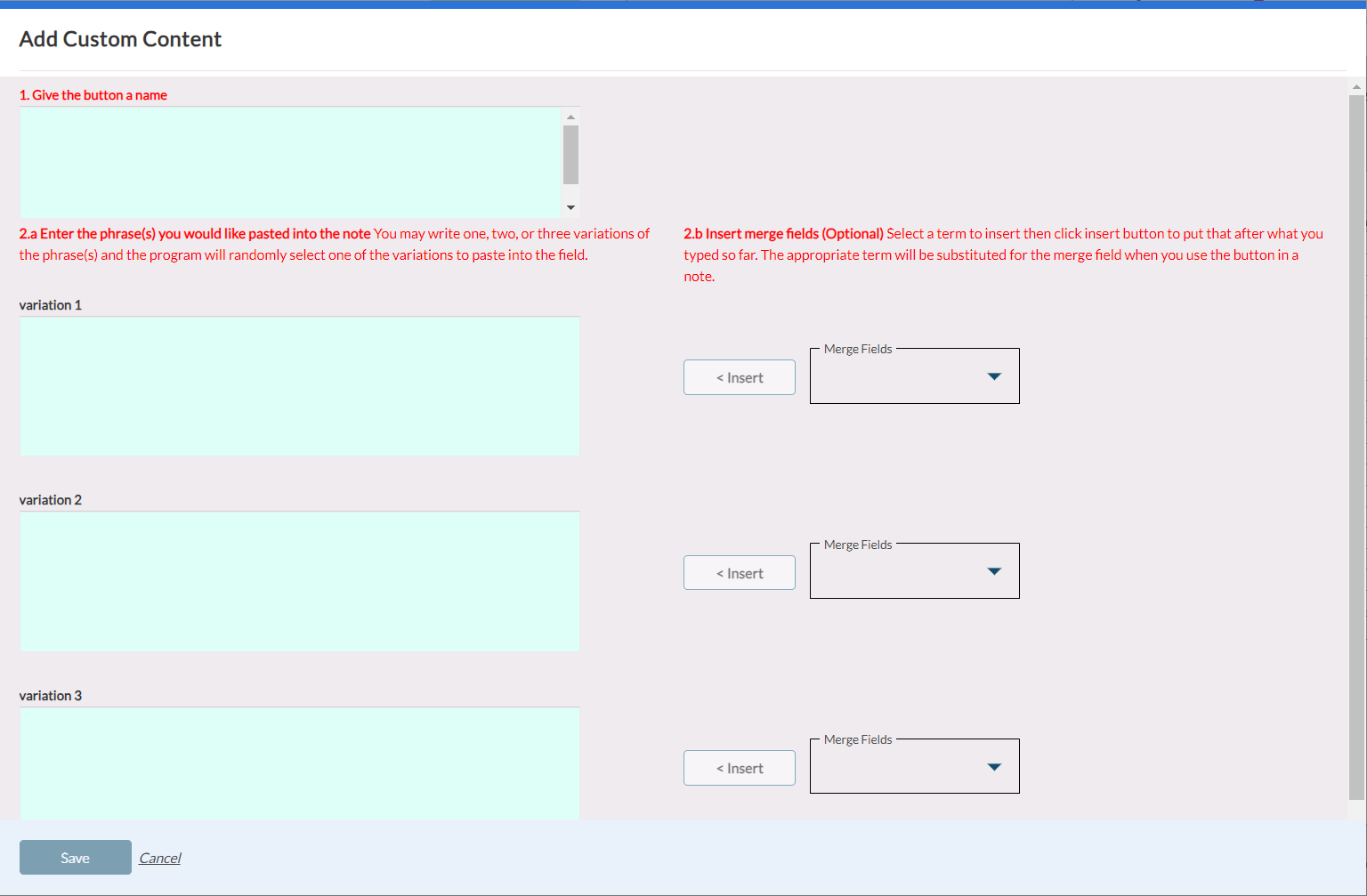 When you click the Create Custom Button option, the Add Custom Content screen appears as shown below that allows you to create custom content.