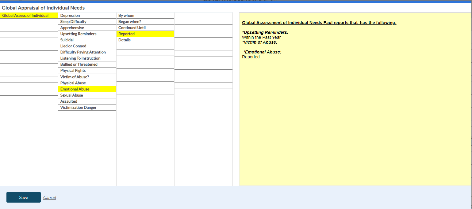 When you select the Global Appraisal of Individual Needs button in the Dimension 3 tab, the following screen appears to enter the shrub content. Once you save the shrub content, it appears in the yellow card within the Dimension 3 tab with the risk rating details.