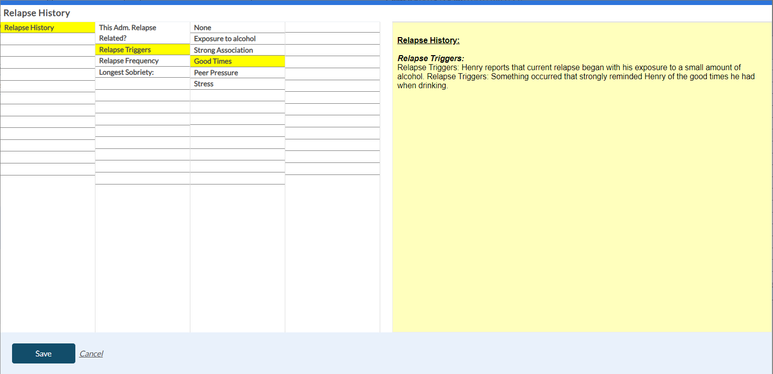 When you select the Relapse History button in the Dimension 5 tab, the following screen appears to enter the shrub content. Once you save the shrub content, it appears in the yellow card within the Dimension 5 tab with the risk rating details.
