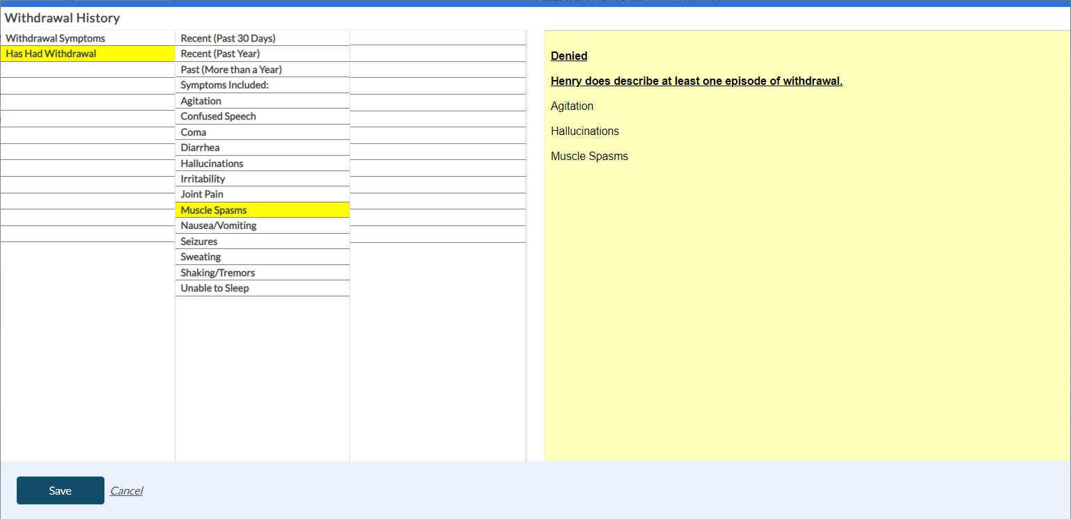 When you select the CIWA: Alcohol Withdrawal History button in the Dimension 1 tab, the following screen appears to enter the shrub content. Once you save the shrub content, it appears in the yellow card within the Dimension 1 tab with the risk rating details.