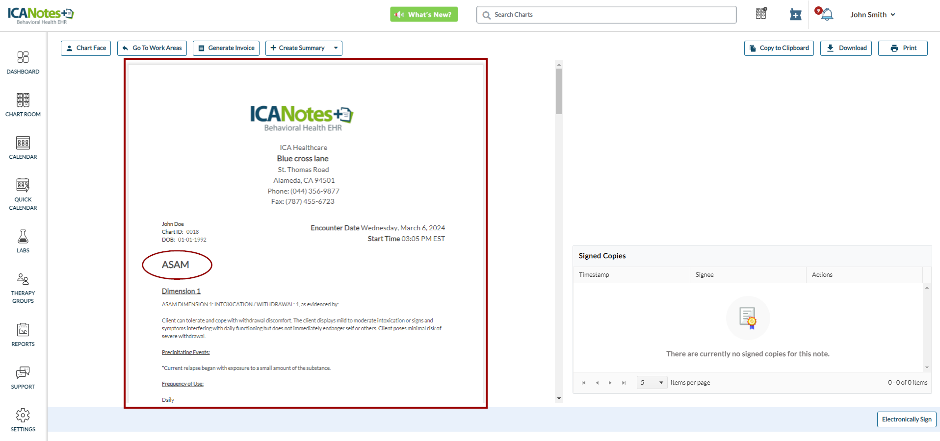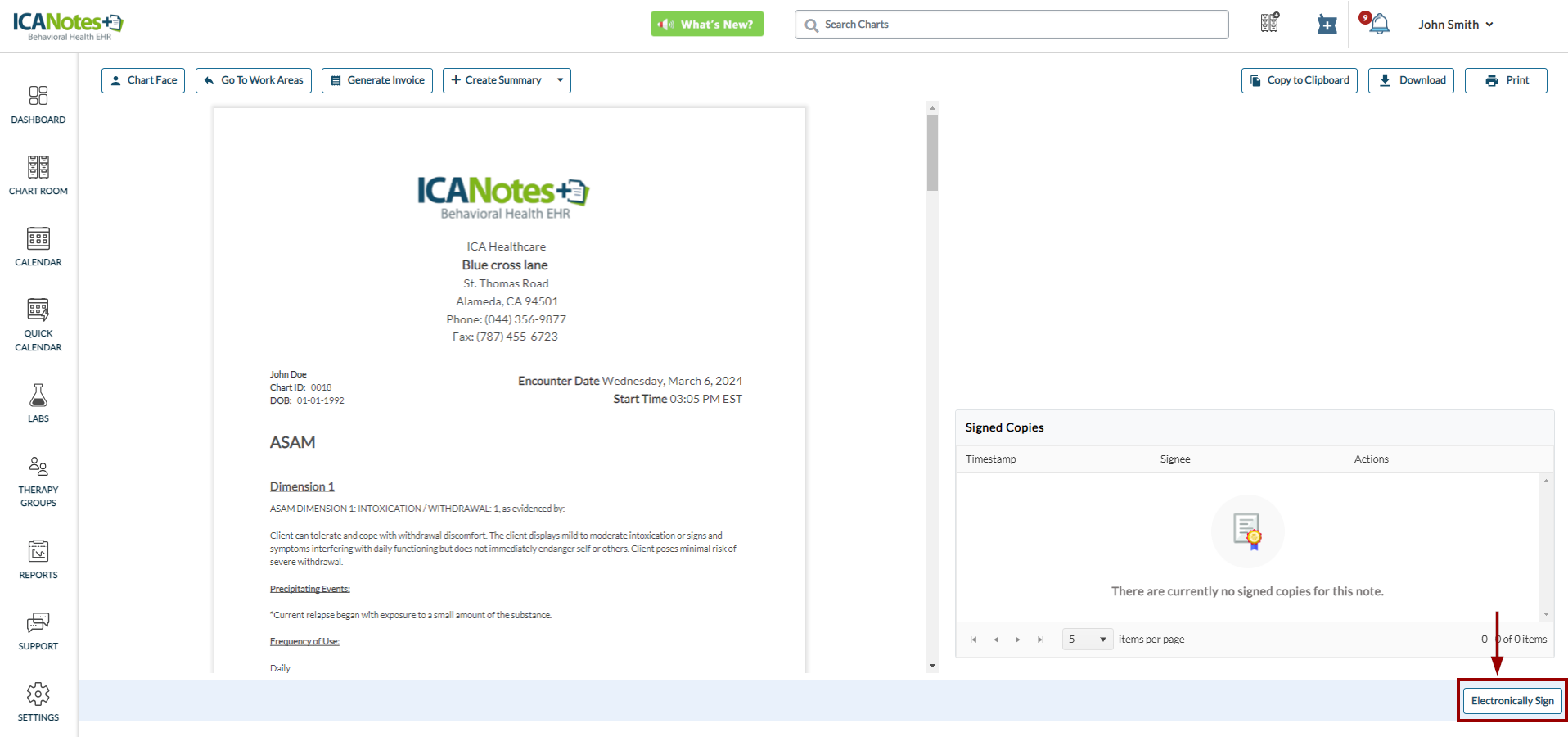 Upon compiling the ASAM note, you can capture electronical signature on the note. Locate the Electronically Sign button in the bottom right side on the compiled note.