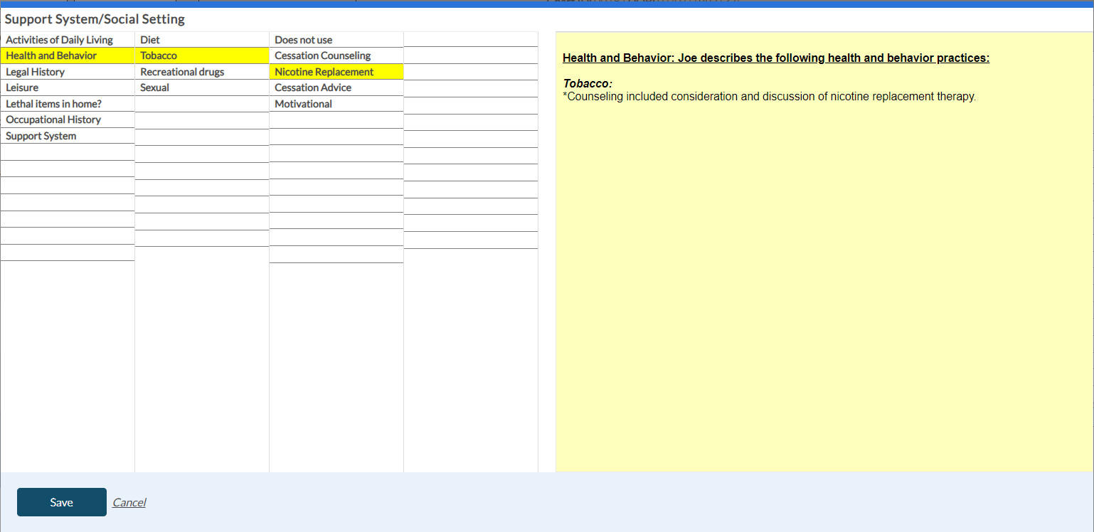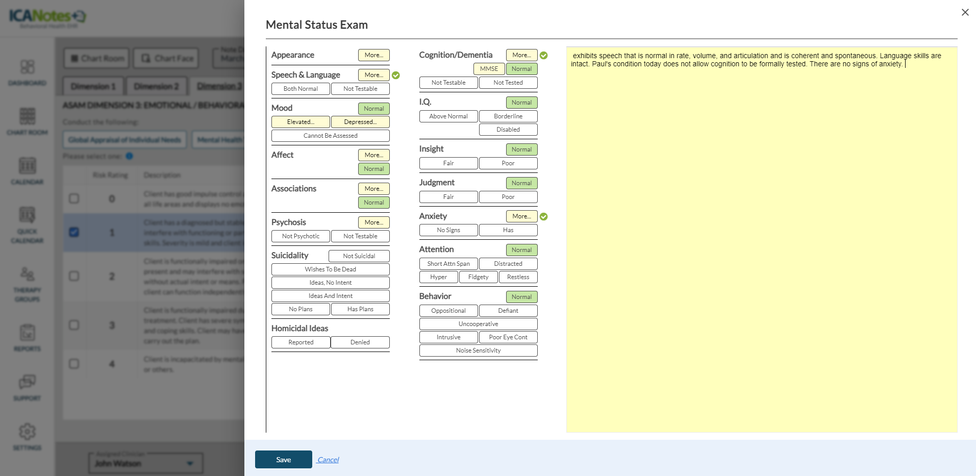 When you select the Mental Status Exam button in the Dimension 3 tab, the following screen appears to enter the shrub content.