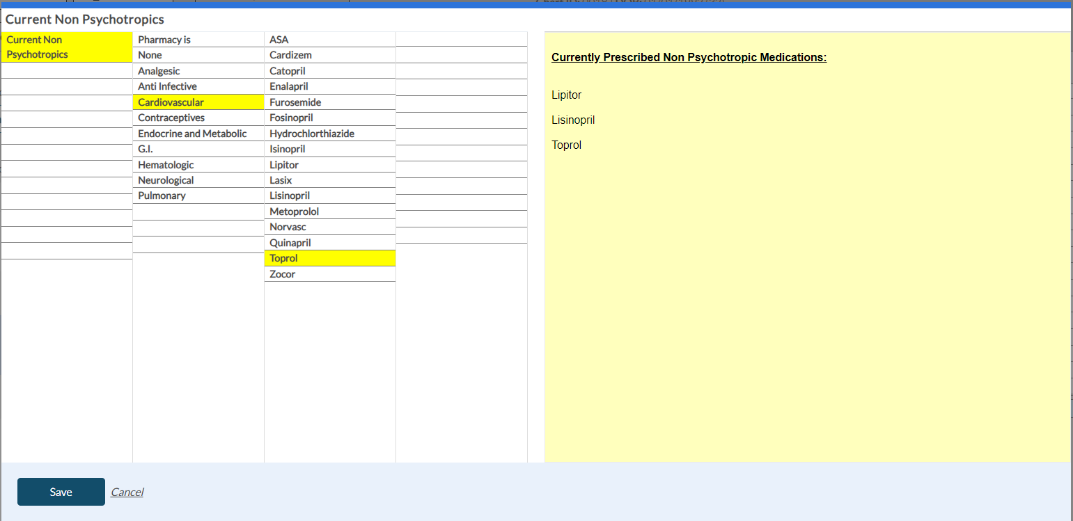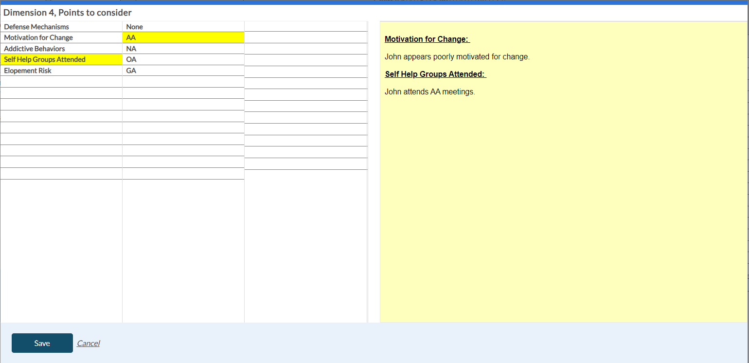When you select the Psychotropic History button in the Dimension 2 tab, the following screen appears to enter the shrub content. Once you save the shrub content, it appears in the yellow card within the Dimension 2 tab with the risk rating details.