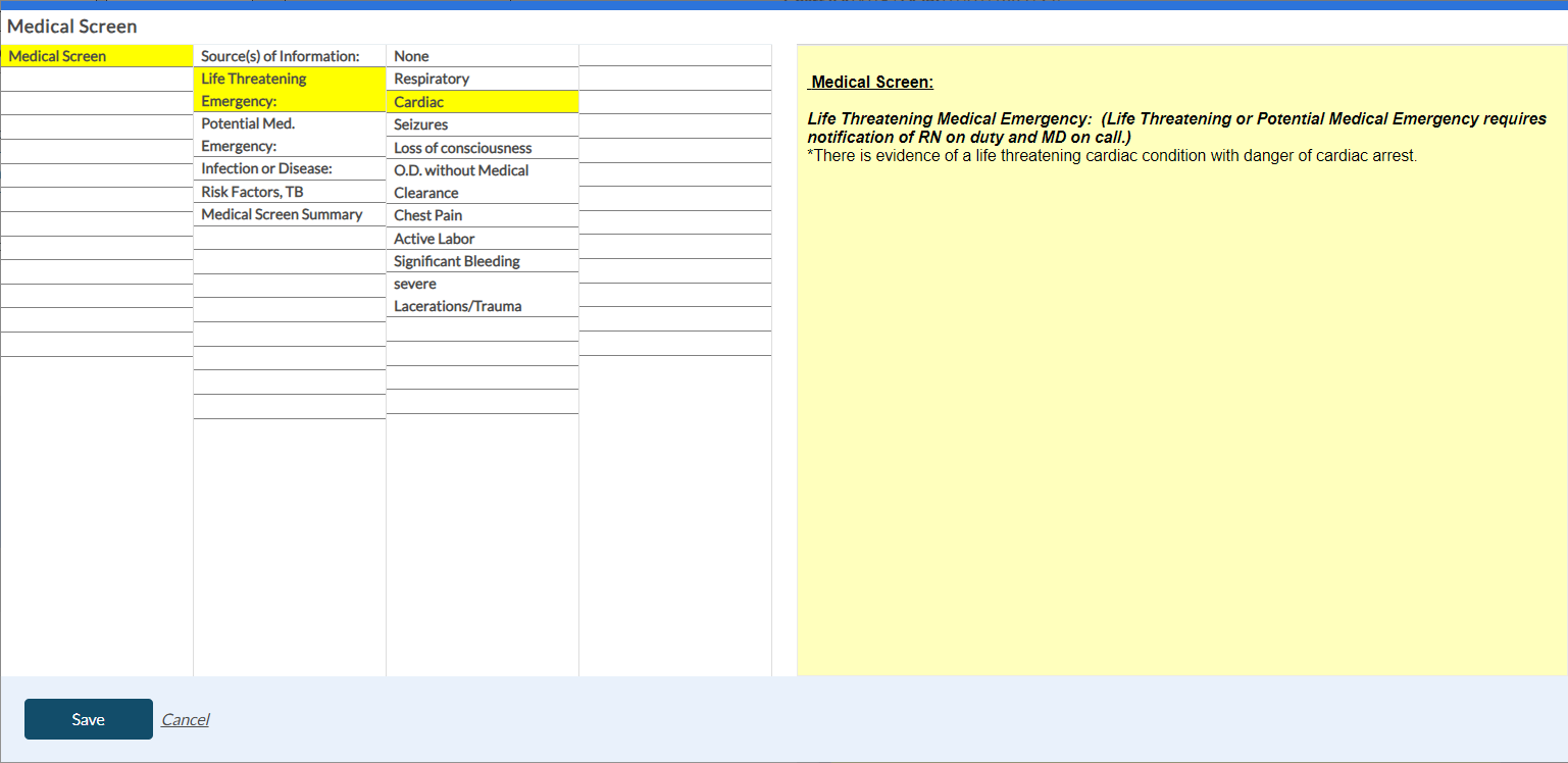 When you select the Medical Screen button in the Dimension 2 tab, the following screen appears to enter the shrub content. Once you save the shrub content, it appears in the yellow card within the Dimension 2 tab with the risk rating details.