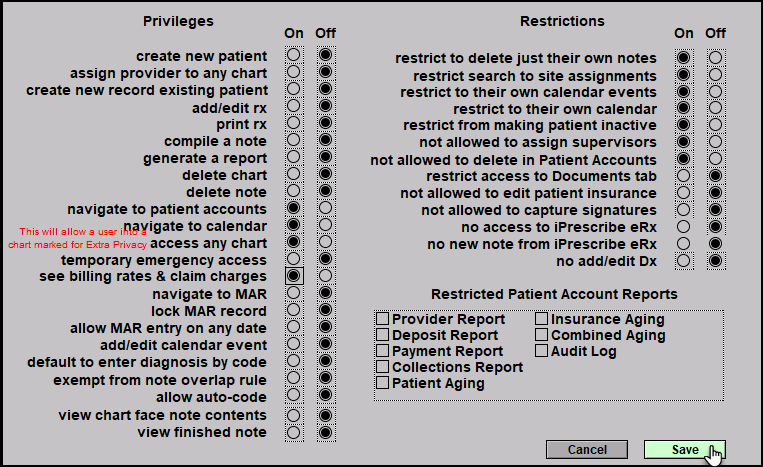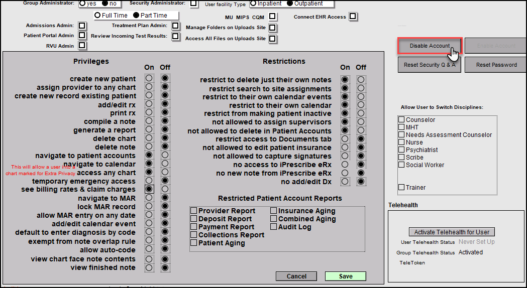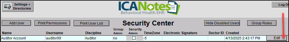 Security administrators can create an auditor login for their account. The following steps demonstrate how to do this. A Security Administrator can create the user and there is a minimal charge for a month. When no longer needed, the Security Administrator should disable the account. Please note: accounts set to the Auditor discipline will not have access to the full Chart Face. When accessing a patient chart the auditor will be directed to the Documents tab.