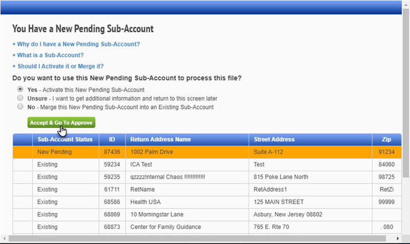In the pop-up, click the radio button to Yes - Activate this New Pending Sub-Account, then click to Accept & Go to Approve.