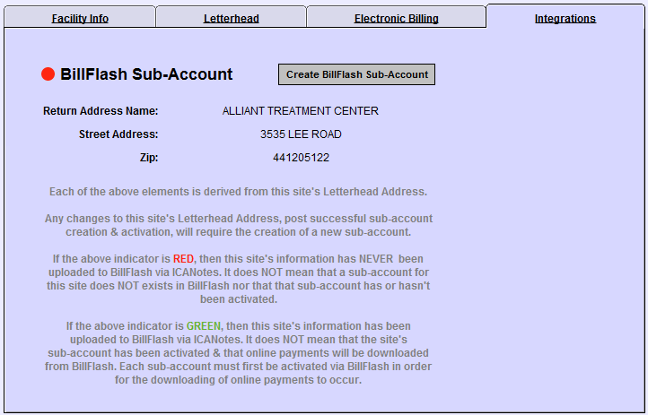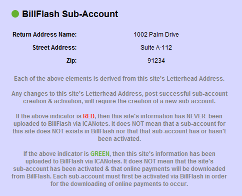 Click OK to return to Settings. The BillFlash Sub-Account indicator will have turned from red to green, indicating setup on the ICANotes side is complete.