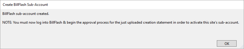 You'll receive a second prompt confirming the sub-account has been created, and instructing you to login to your BillFlash account to begin the approval process. This step is necessary in order to activate the sub-account on BillFlash's side. If the creation fails, you will instead see a dialog box warning ICANotes was unable to create the BillFlash sub-account, as well as error details.