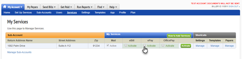 As a last step, you'll want to make sure you enable ePay for the sub-account if you intend to take credit card payments at this site. To do this, navigate in BillFlash to My Account > Services and locate the new sub-account. In the ePay column, click to Activate the site.