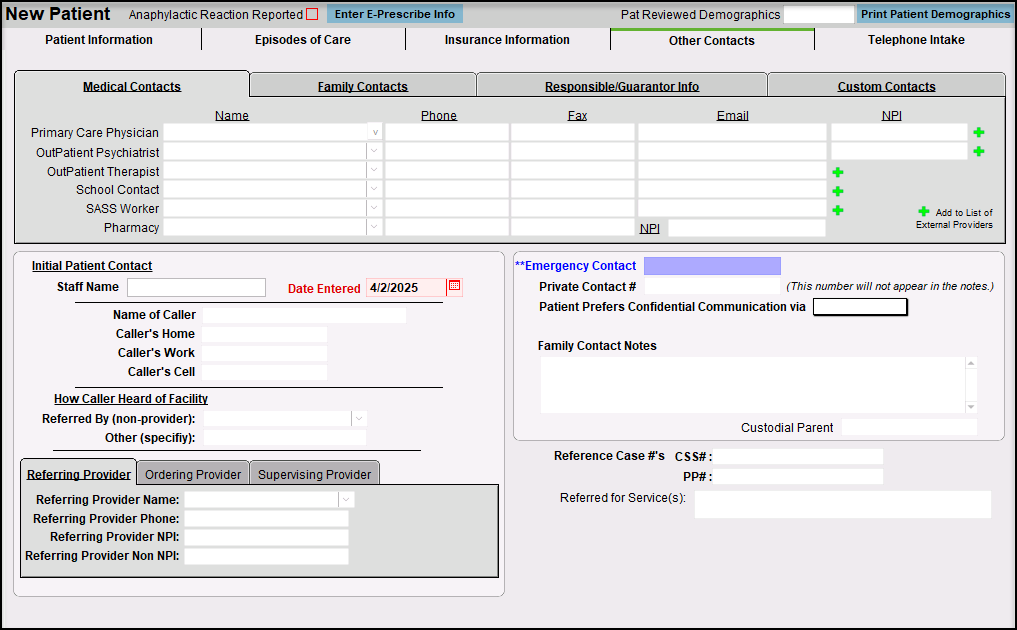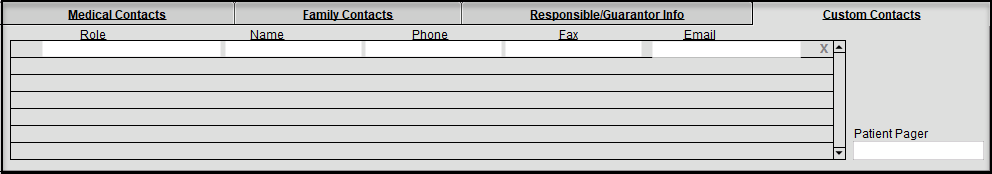 Other Contacts > Custom Contacts tab: This tab allows you to input other contacts for the patient.