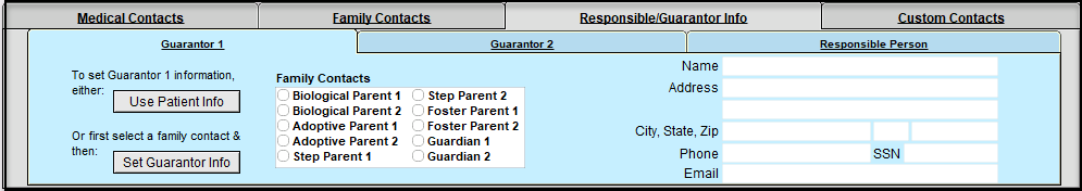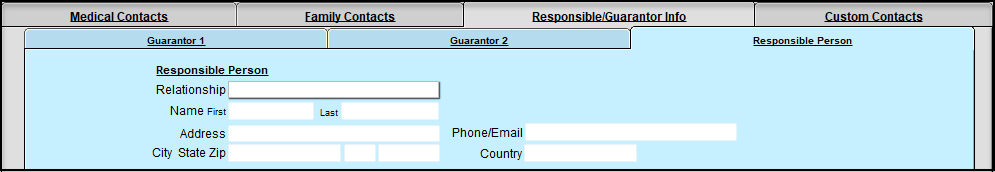 Other Contacts > Responsible/Guarantor Info > Responsible Person tab: This tab is for documenting the responsible person.