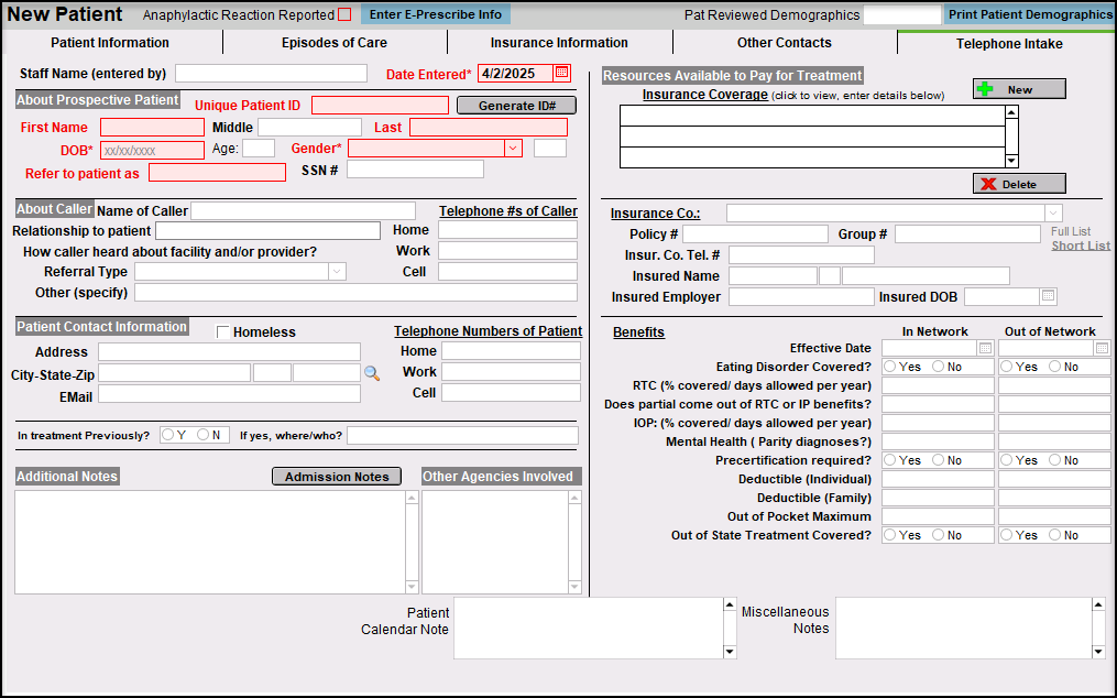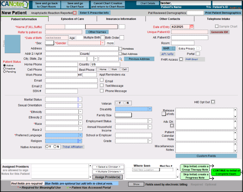 Patient Information: This page is the default demographic page. The red fields are required before a patient can be saved. Blue fields are optional but add information to clinical notes.