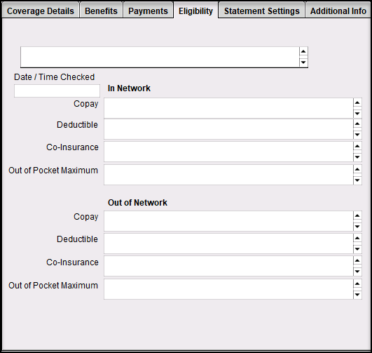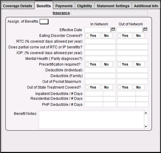 Insurance Information > Benefits tab: This can be filled out to show coverage details.