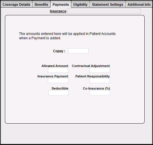 Insurance Information > Payments tab: This area assists within the patient account when payments are applied.