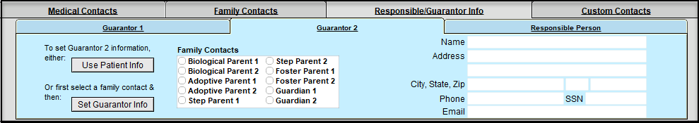 Other Contacts > Responsible/Guarantor Info > Guarantor 2 tab: This tab is for documenting a second guarantor.