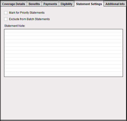 Insurance Information > Statement Settings: For customizing individual statement notes to print on statements.