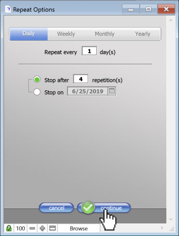 button. This will allow you to schedule a clinician's lunch for the same time every day, block out the first of every month for payroll, etc. Click the Continue button to save the repeat options.