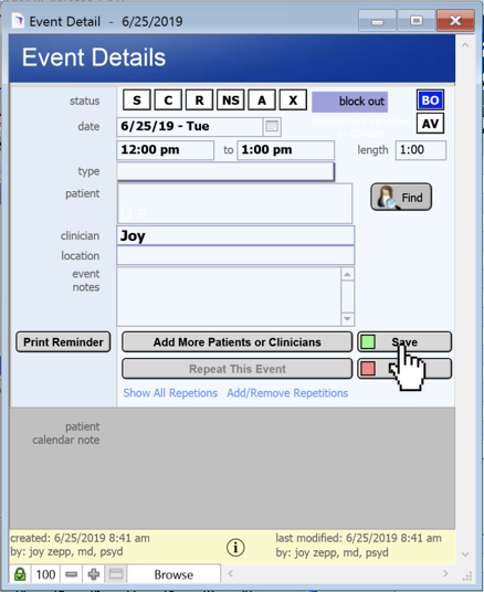 Make sure that you also select the proper date, time, clinician for the block out. Selecting a "type" or "patient" for this event is optional.