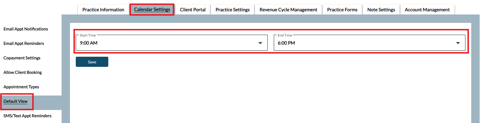 Set up your practice default view for the calendar start and end time. Use the Save button to apply your changes.