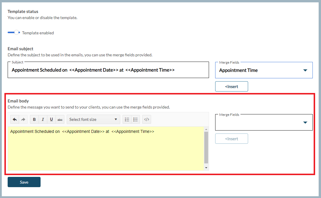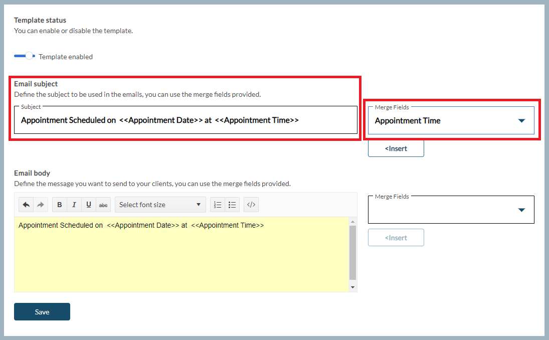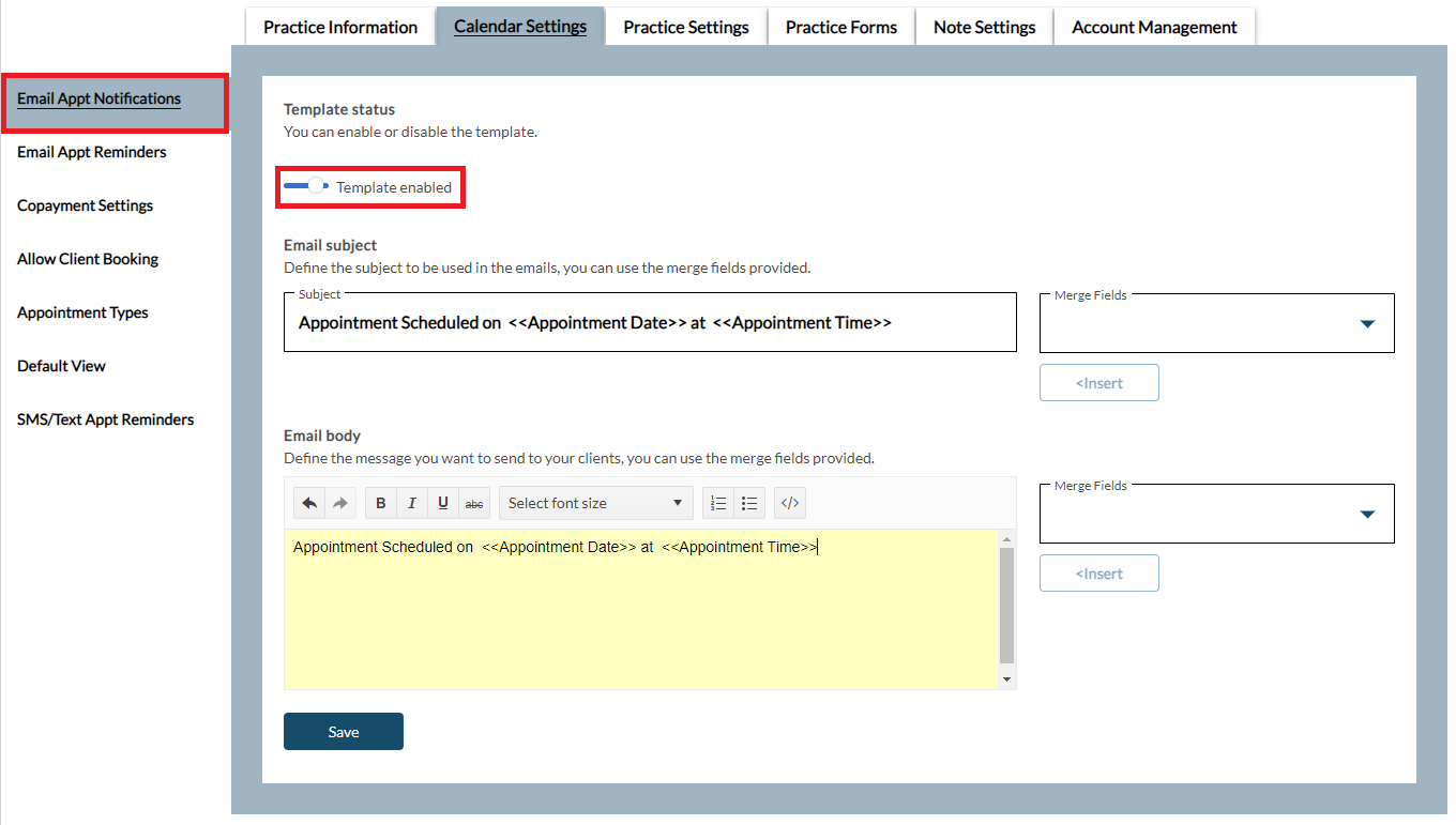 Next, define the Email Subject to be presented in the email notification. The Merge Fields menu may be used to insert the Practice Name, Client's Legal First Name, Client's Legal Last Name, Appointment Date, Appointment Time and Clinician Name linked to the appointment.