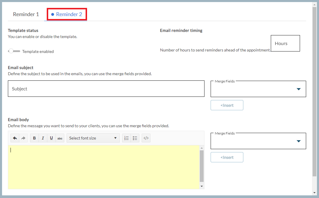 To set up a second email reminder, scroll up and select the Reminder 2 tab. Repeat these steps to enable a second email reminder.