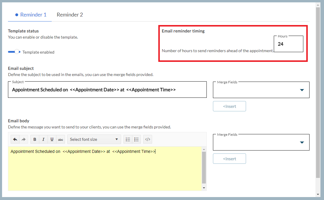Specify the Email Reminder Timing with the number of hours to send the reminder ahead of the appointment time.