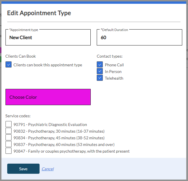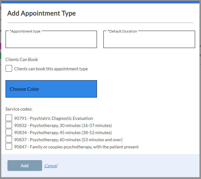 From here you may give the appointment type a name, set the default duration, allow the appointment type to be booked by clients for certain contact types, choose a color to display and associate the appointment type to a service code(s). Click Add/Save when done.