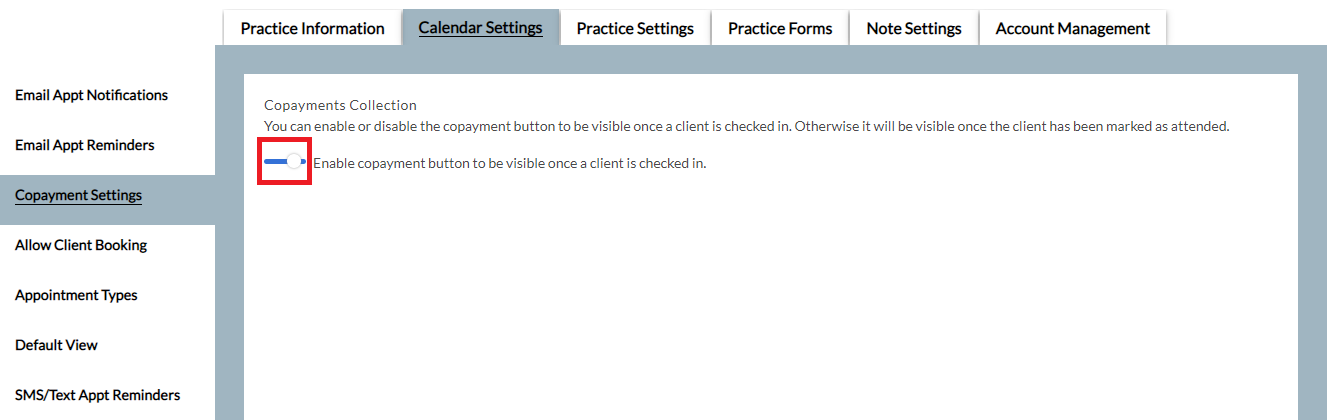 Toggle this setting on if you wish for the copayment button to be visible once a client is checked in. Otherwise it will be visible once the client has been marked as attended.