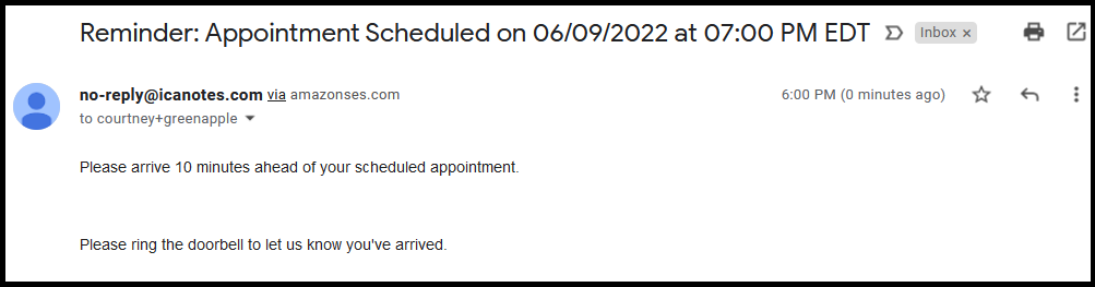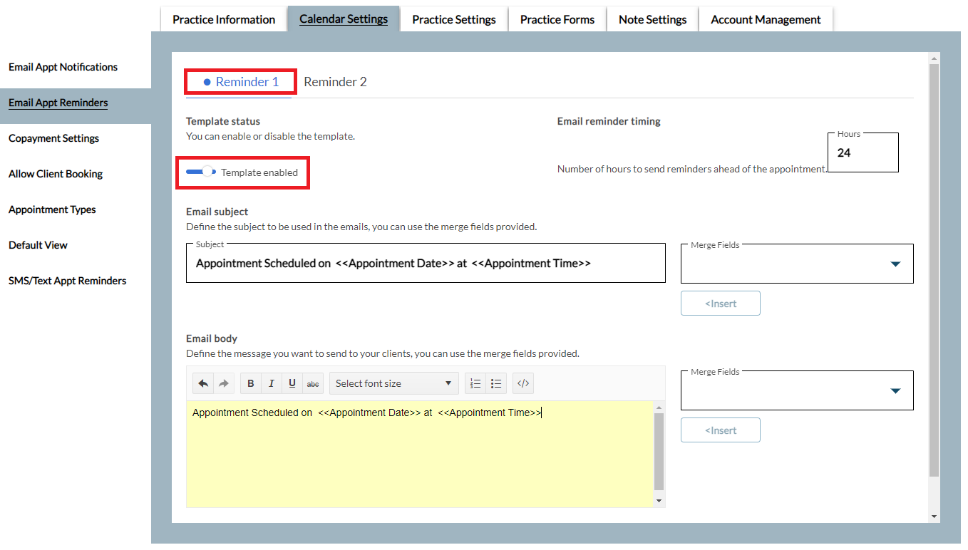 You can enable up to two appointment reminders to email your client an appointment reminder in advance of their appointment. You control when your clients receive these reminders. Your client must have an email address specified in their chart to receive email appointment reminders.