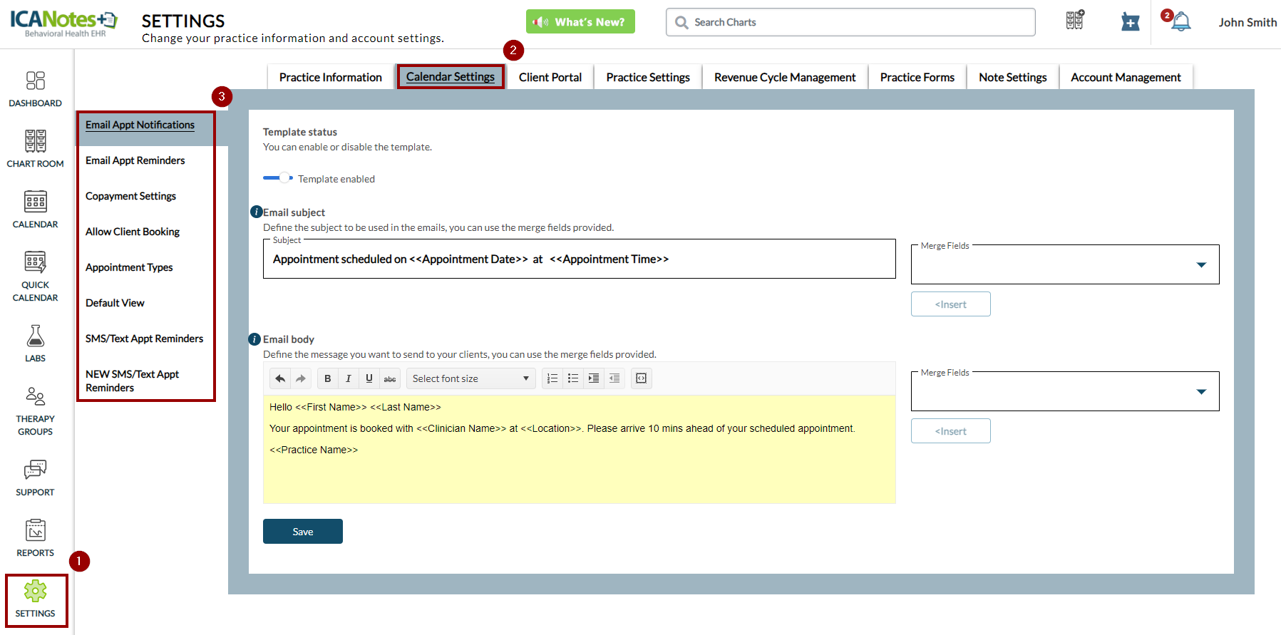 You have the option to automatically send text (SMS) reminders to clients for upcoming appointments. ICANotes+ will add the appropriate charge to your monthly invoice based on your usage. The cost is $0.05 (5 cents) per SMS notification/reminder. This Knowledge Base guide demonstrates how practice owners can enable text appointment reminders for their clients.