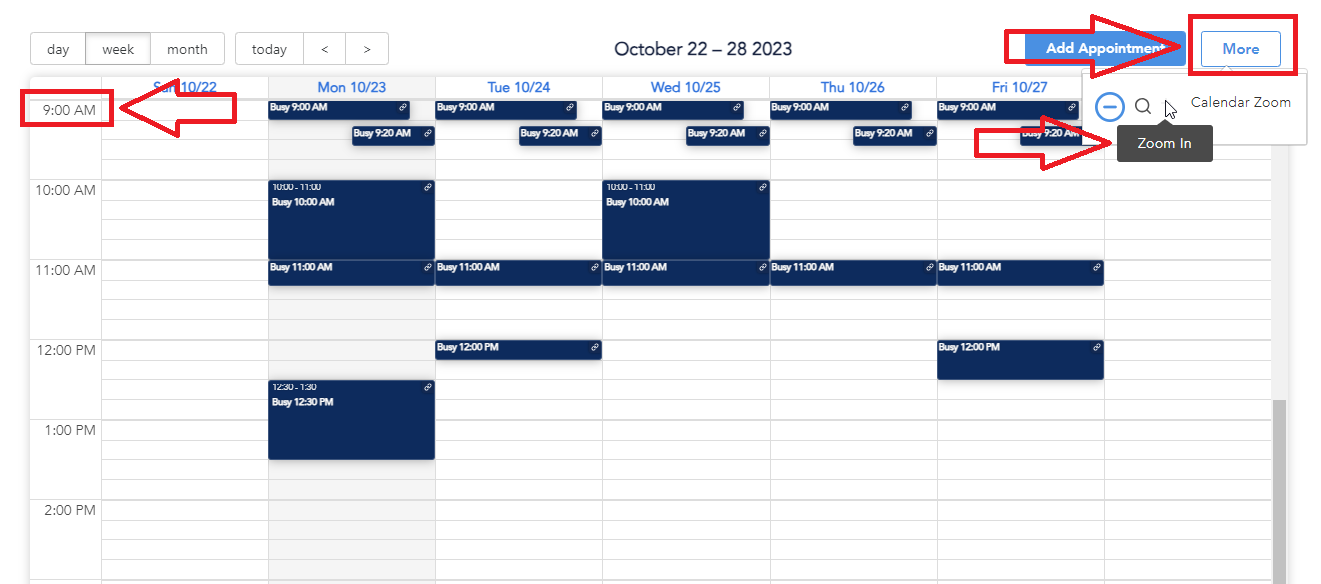To view the configured timeframe on your Calendar page, click the More button in the top right corner and zoom in. It might be necessary to click the plus icon two or three times to clearly see the default start/end time. Please be aware that adjusting your browser zoom settings will not affect this process.