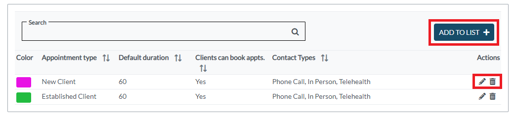 Use the ADD TO LIST+ button to add a new appointment type. Use the pencil icon to edit an existing appointment type. Use the trashcan icon to delete an appointment type.