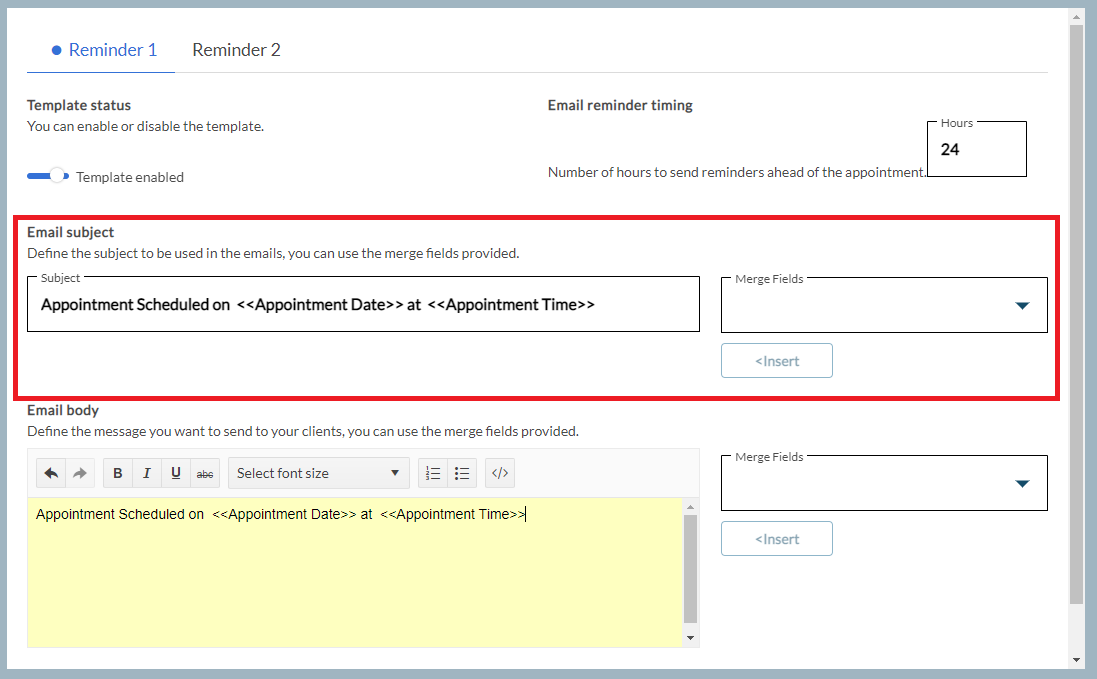 Next, define the Email Subject to be presented in the email reminder. The Merge Fields menu may be used to insert the Practice Name, Client's Legal First Name, Client's Legal Last Name, Appointment Date, Appointment Time and Clinician Name linked to the appointment.